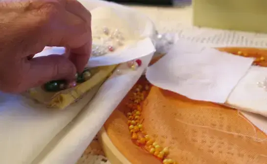 Hvordan trer hun nål og tråd? Den teknikken har hun funnet fram til selv. Hun tar nål og enden på tråden opp til munnen, kjenner forsiktig med tungen hvordan «øyet» på nåla er – og så bruker hun tungen til å træ enden av tråden inn på nåla. Noen av perlene hun syr med er bittesmå glassperler, sydd med en tynn sytråd. Disse perlene trer hun også på med hjelp av tungen. Slik fester hun en og en liten perle til synålen og broderer de fast. Mønster og form komponerer hun etter hvert som hun arbeider.