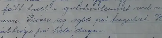 «24.10. (1954) Har fått hull i golvlinoleumet ved å bruke tennene. Prøver seg også på tregolvet. Har spesialtrøye på hele dagen.»