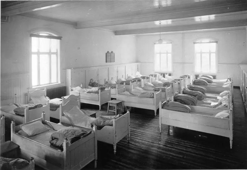 Som vanlig ble jeg vekket klokka seks av inspektrise fru Kristiansen, som hadde morgenvakten. Hun kom bort til sengen min og rusket godt tak i meg, før hun bestemt fortsatte videre til neste seng. Jeg visste at det bare var å stå opp i en fei og hoppe i klærne før hun var ferdig med å vekke resten av de 17 jentene på salen. Etter en rask tur ut i gården for å tømme nattpottene og få stelt seg litt, bar det inn på klasserommet for å gjøre litt lekser før frokost. Jeg fikk da svelget grøten og den lunkne kaffen i dag også. For sulten er jeg jo, selv om det ikke smaker så mye.